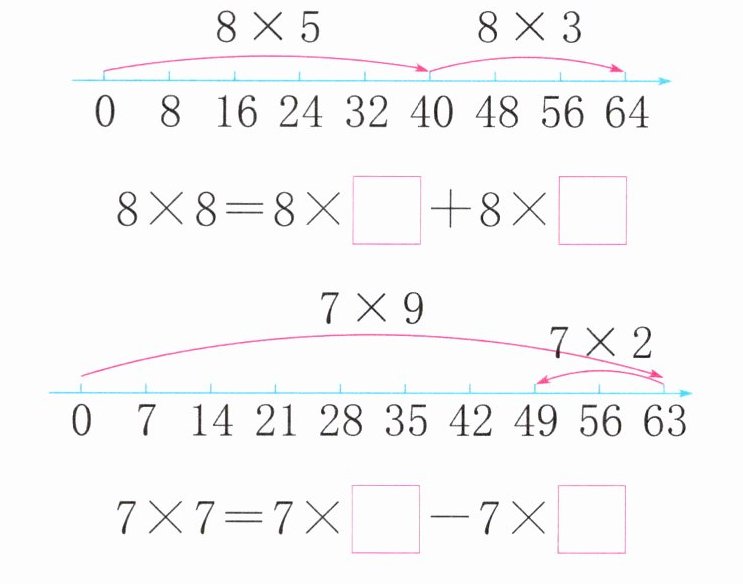 解析:由题意可知,红红左边有3人,右边有2人,且每行人数相等,所以每行有 $3 + 1 + 2 = 6$(人)。一共有8行,求一共有多少人做室内操,用乘法计算,列式为 $6×8 = 48$(人)。