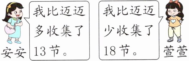 由图可知,安安收集的节数 $=$ 迈迈收集的节数 $+ 13$,萱萱收集的节数 $=$ 迈迈收集的节数 $- 18$。因此,安安收集的与萱萱收集的相差 $13 + 18 = 31$(节)。