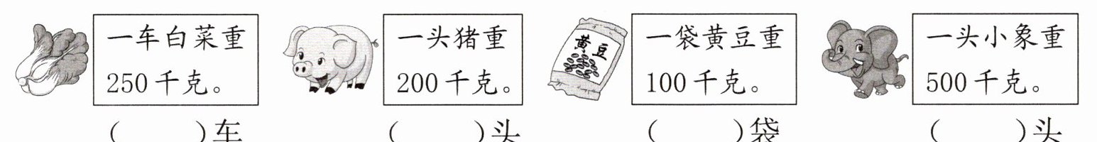 3. 新素养 数感 在( )里填合适的数,使每种物品或动物的总质量恰好是1吨。