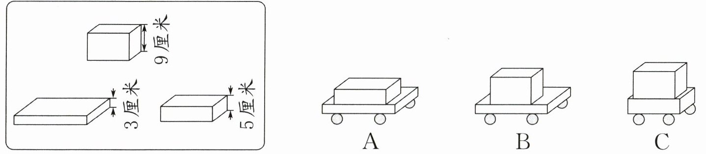 5. 小刚用积木搭出了一座高为 140 毫米的桥和三辆玩具汽车,这些汽车的车轮高度都是 40 毫米,(