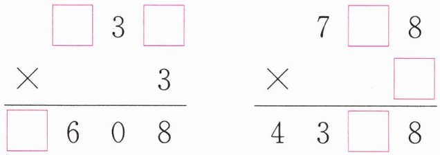 解析:第一个竖式,积的个位上是 8,因为 $3×6 = 18$,所以确定三位数的个位上是 6。十位上 $3×3 + 1 = 10$,积的十位上是 0,向百位进 1。因为 $3×5 + 1 = 16$,所以确定三位数百位上的数字是 5。第二个竖式,积的个位上是 8,因为 $8×6 = 48$,$8×1 = 8$,所以一位数可能是 6,也可能是 1。因为积是四位数,所以一位数是 6。三位数十位上的数字可以用列举法去试,最后确定三位数十位上的数字为 1 或 2。