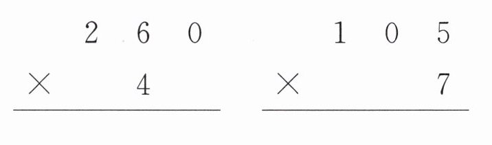 解析:因为竖式中三位数的中间是0,所以积的前两位数是三位数百位上的数字与一位数的积,后两位数是三位数个位上的数字与一位数的积。结合这七个数字的特点分析可得:$7×8=56$,$4×8=32$(或$3×8=24$),所以一位数只能是8,三位数可能是704、407、703或307,由此填写竖式。