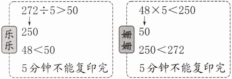 新趋势 算法探究 一台复印机每分钟能复印48页。要复印一份272页的书稿,5分钟能复印完吗?两名同学分别用了下面两种估算方法,(