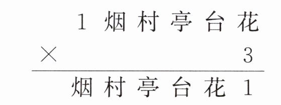 4 2 8 5 7 解析:找准突破口,想3乘几的得数的末位是1,再逐步进行推理。从个位看起,3 乘“花”的得数的末位是 1,想 $3×7 = 21$,因此花 = 7,向前一位进 2;3 乘“台”的得数加上进位数 2,末位是 7,所以 3 乘“台”的得数的末位是 5,想 $3×5 = 15$,因此台 = 5,向前一位进 1;3 乘“亭”的得数加上进位数 1,末位是 5,所以 3 乘“亭”的得数的末位是 4,想 $3×8 = 24$,因此亭 = 8,向前一位进 2;3 乘“村”的得数加上进位数 2,末位是 8,所以 3 乘“村”的得数的末位是 6,想 $3×2 = 6$,因此村 = 2;3 乘“烟”的得数的末位是 2,想 $3×4 = 12$,因此烟 = 4,向前一位进 1;$3×1 + 1 =$ 烟 = 4,符合题意。
