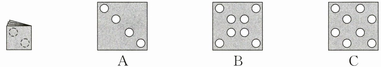 7. 新素养 空间观念 军军将一张正方形纸对折两次后,沿虚线剪去2个圆(如左下图),展开后得到的图形是(