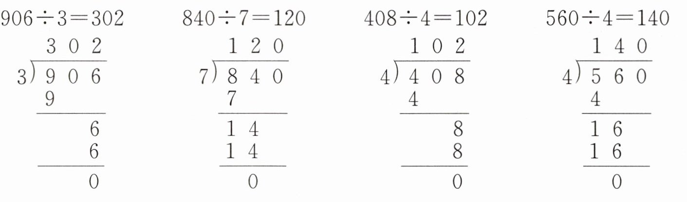 1. 新趋势 说理表达 小明连续做了下面的4道竖式计算题后,发现被除数中有0,商中也有0。于是他得出结论:只要被除数中有0,商中就一定有0。你同意他的结论吗?若不同意,请举出反例说明。