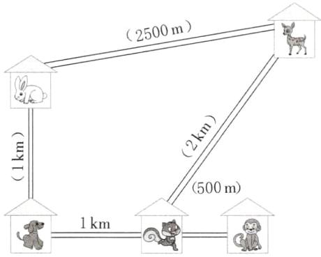 3.如图所示为森林里小动物们家的分布图。从小松鼠家到小狗家的路程大约是1km,那么其他相邻两只小动物的家大约相距多远?估一估,填一填。