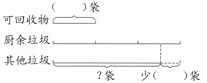 4. 某垃圾回收中转站今天回收了28袋可回收物,厨余垃圾的袋数是可回收物的3倍,其他垃圾比厨余垃圾少13袋。该垃圾回收中转站今天回收了多少袋其他垃圾? (先把线段图补充完整,再解答)(6分)