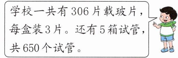 3. 学校一共有306片载玻片,每盒装3片。还有5箱试管,