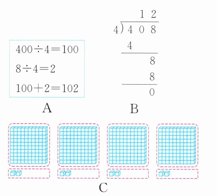 (1)(算理理解)下面计算$408÷4$的方法中,(