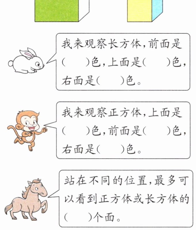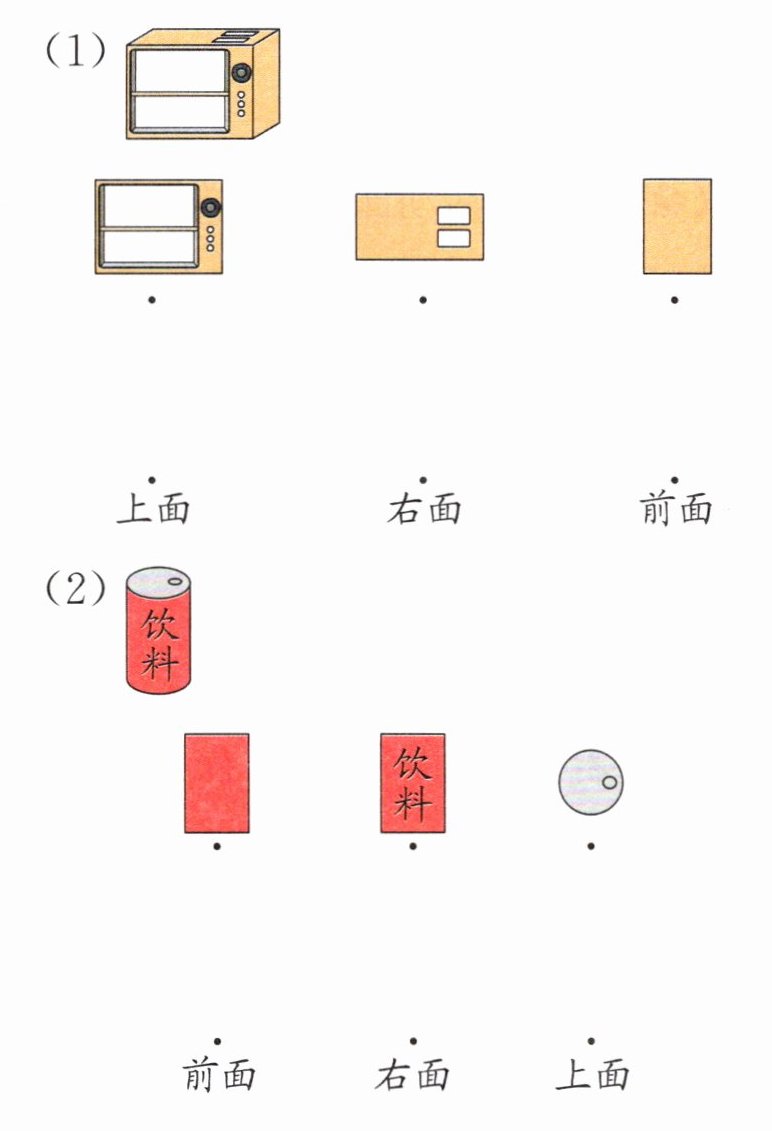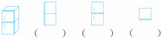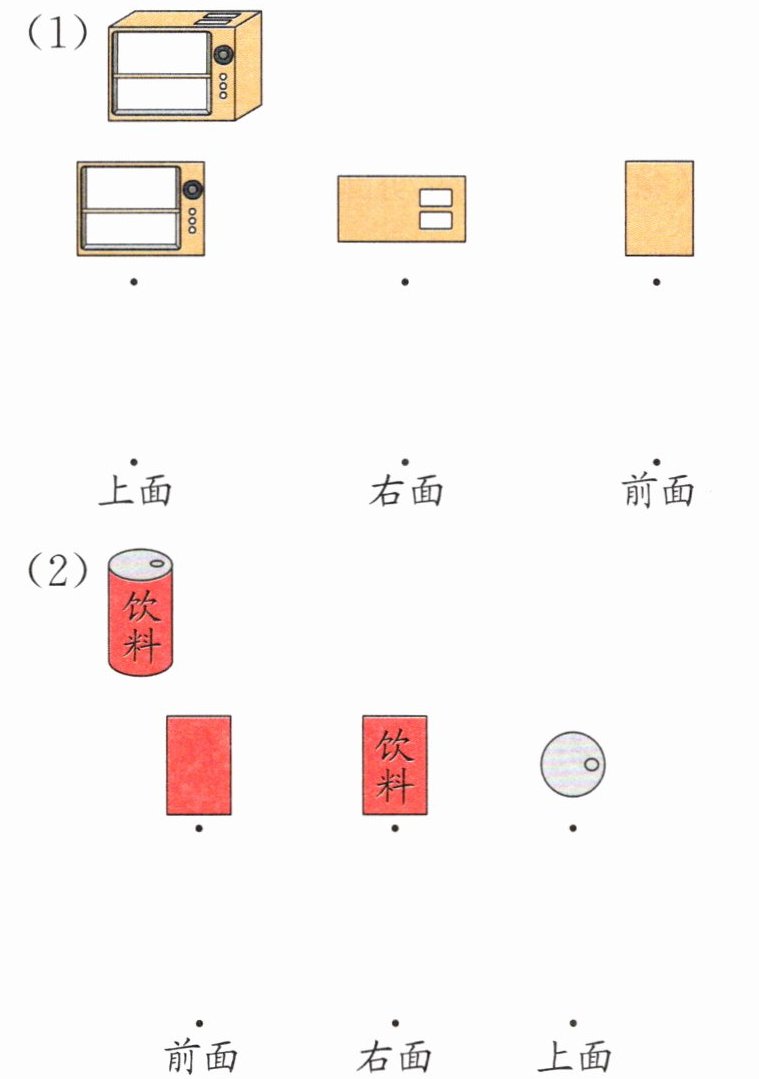 3. 小明从前面、右面和上面观察家里的冰箱,你知道下面三幅图分别是他从哪一面看到的吗?填一填。