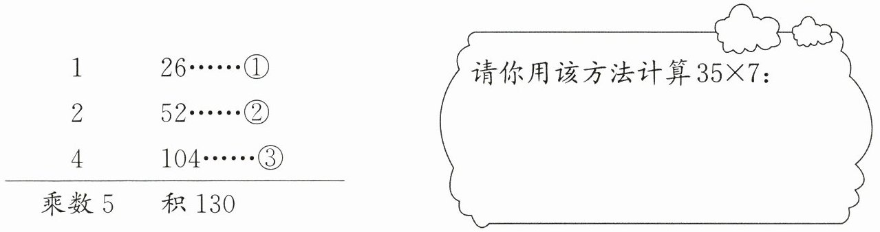 新趋势 数学文化 古埃及纸书上记载着一种乘法——倍乘法,就是先加倍计算,再组合不同的倍数,从而完成计算。左下图是用倍乘法计算$26×5$的过程,每行由上一行取2倍得出,最后把①③两项加起来。
