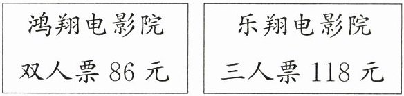 鸿翔电影院:6÷2=3(张) 86×3=258(元) 乐翔电影院:6÷3=2(张) 118×2=236(元) 236<258 选乐翔电影院比较实惠