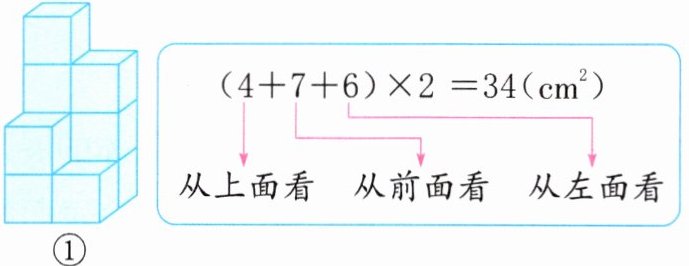 7. 下面两个几何体都是由棱长为1cm的小正方体搭成的。几何体①的表面积可以按其右边框中的方法计算。几何体②的表面积是(