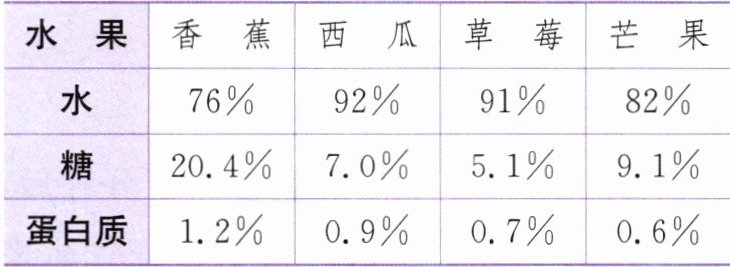 2. 下表是几种水果中水、糖和蛋白质的含量。