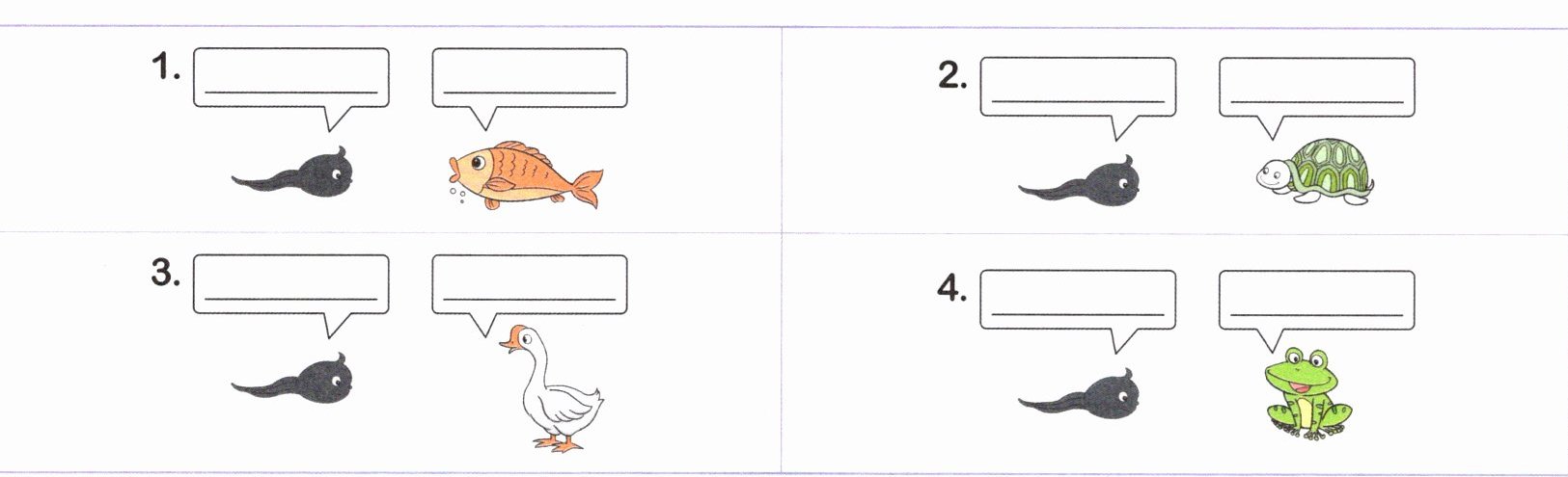 五、[新素材]小蝌蚪找不到妈妈了!它在水里游来游去很是着急,一路上它遇到了鲤鱼妈妈、乌龟妈妈和白鹅妈妈。它最终找到妈妈了吗?请读一读下面的句子,选择合适的选项补全绘本,选项可重复使用。