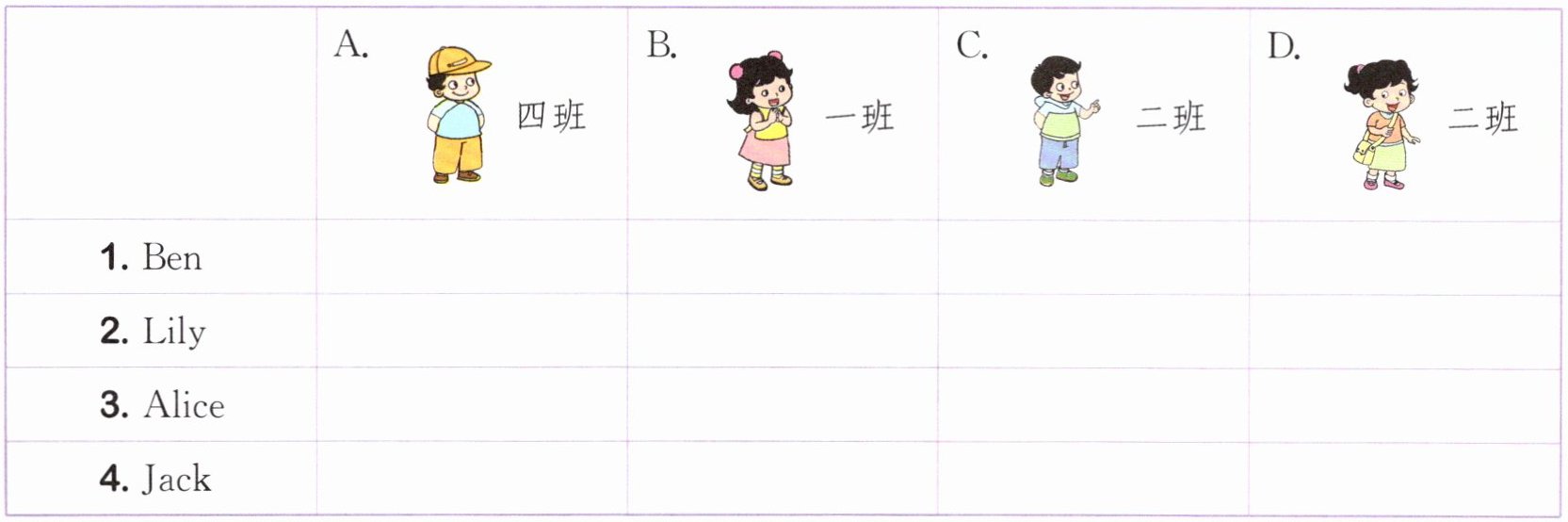 四、[新考法]马克有很多朋友,他们在同一个班级吗?请根据马克的介绍,在表格相应位置画“√”。
