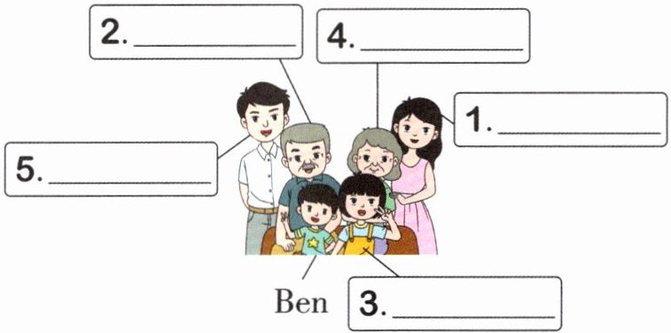 图略 One possible version: My family This is my family photo. Look, this is my grandpa. This is my grandma. This is my uncle. This is my aunt. This is my cousin. He is my father. She is my mother. This is me! I have a big family. I love my family.