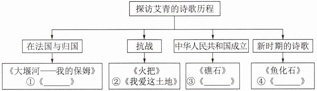 5. 阅读《艾青诗选》时,小语绘制了“艾青的诗歌历程”思维导图。根据不同阶段艾青诗歌的特点,为图中①③④处选择恰当的诗篇。