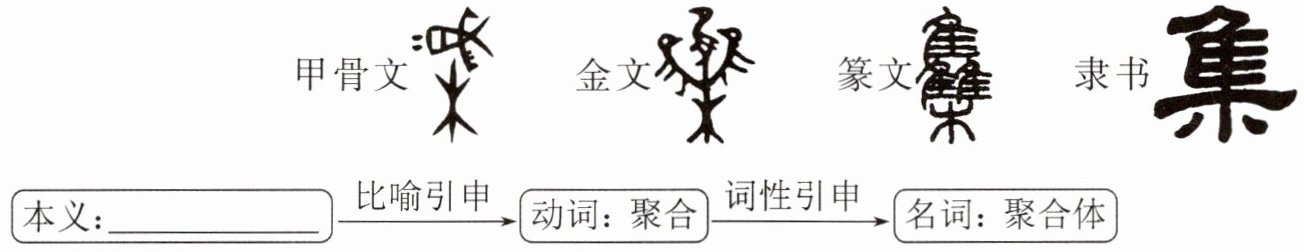 1. 根据“集”字的字形和意义演变过程,推测“集”的本义,并说明推测思路。