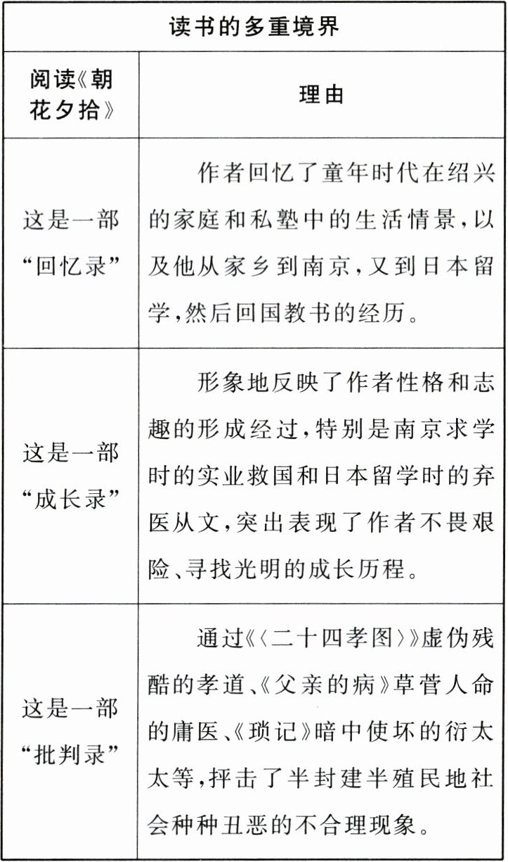 |这是一部“批判录”|通过《〈二十四孝图〉》虚伪残酷的孝道、《父亲的病》草菅人命的庸医、《琐记》暗中使坏的衍太太等,抨击了半封建半殖民地社会种种丑恶的不合理现象。|