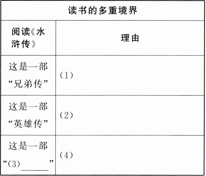 2. 一部好书,往往有生动的故事、鲜明的人物、深刻的主题,给人以精神层面的体悟或教益。请你参考示例,分享阅读《水浒传》的多重境界。(7分)