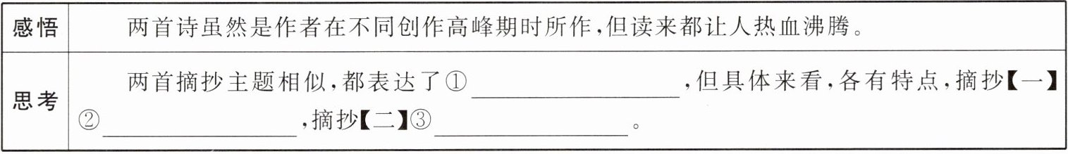 |思考|两首摘抄主题相似,都表达了①______,但具体来看,各有特点,摘抄【一】②______,摘抄【二】③______。|