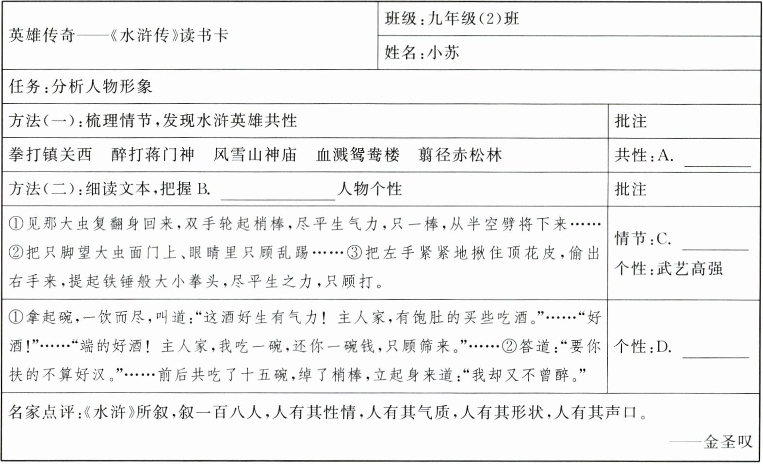 A. 疾恶如仇、本领高强 B. 重点(或:“重要”“主要”) C. 景阳冈打虎 D. 豪爽坦荡