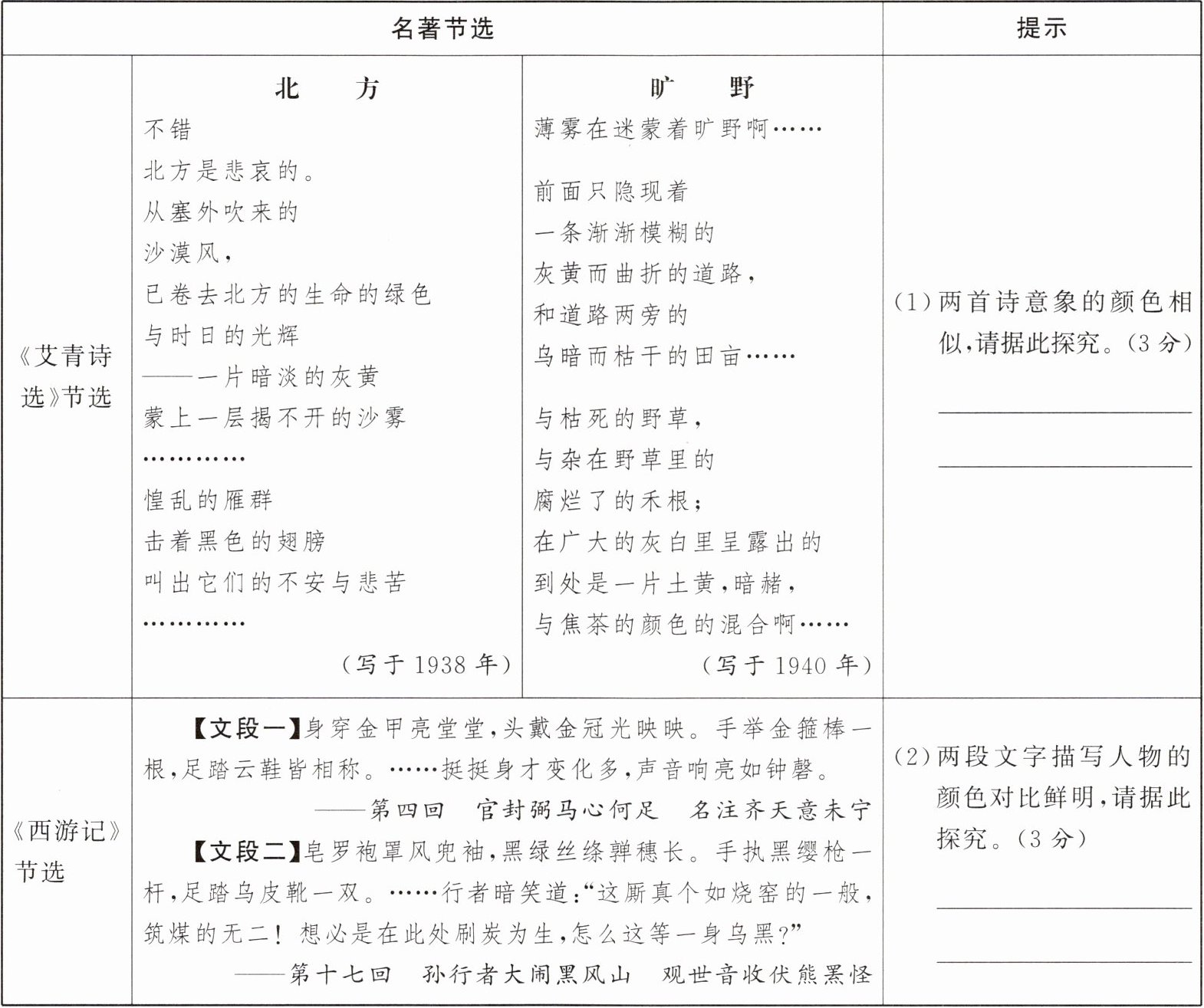 |《艾青诗选》节选|(1)两首诗意象的颜色相似,请据此探究。(3 分)______(2)两段文字描写人物的颜色对比鲜明,请据此探究。(3 分)______|