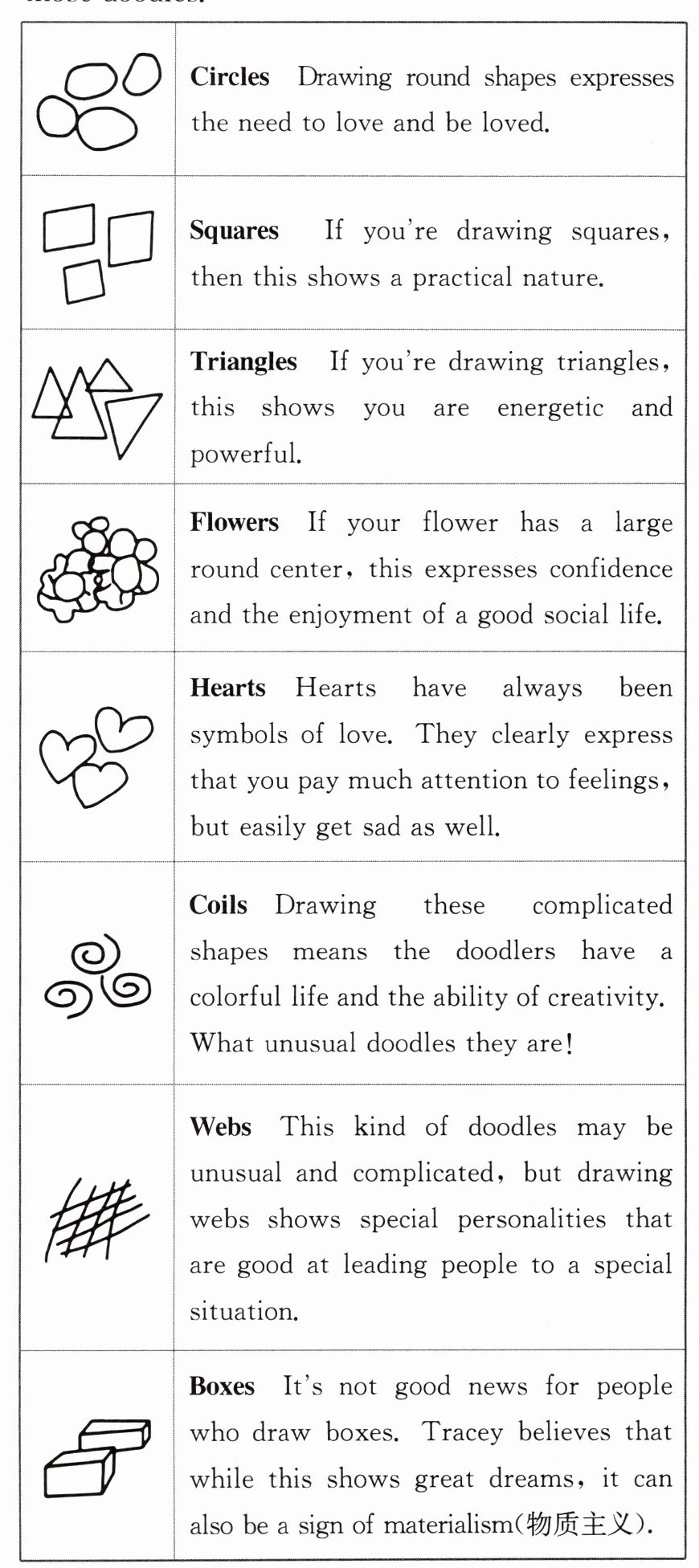 When you are waiting on a phone call with a pen in your hand or feeling bored on a train, you may doodle(乱涂). Consultant Graphology(笔迹咨询师) Tracey has studied the most common doodles and their meaning in a new piece of research. Here she shares the psychology behind those doodles.
