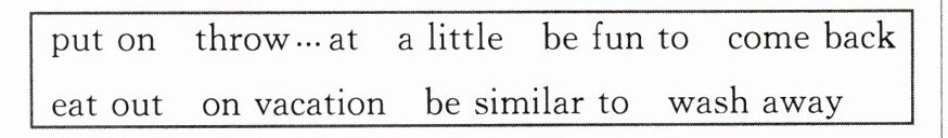 11. on vacation 12. is similar to 13. eating out 14. washes away 15. have put on 16. throwing; at 17. a little 18. are fun to 19. will come back/are coming back