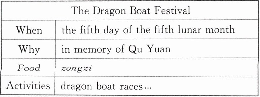 Dear Jack,Let me tell you something about the Dragon Boat Festival. It falls on the fifth day of the fifth lunar month. As one of the most important festivals for Chinese people,it's a time for people to have traditions in memory of Qu Yuan.When we think of the Dragon Boat Festival,we usually think of zongzi and dragon boat races. Every family will share different kinds of zongzi with each other. In addition,dragon boat races are also exciting for people of all ages to watch. We also visit our friends and relatives,enjoying a time of reunion.All in all,behind all these activities lies the true meaning of the Dragon Boat Festival:the importance of understanding history and traditions. I hope that one day you can enjoy the festival,too!Yours,Li Hua