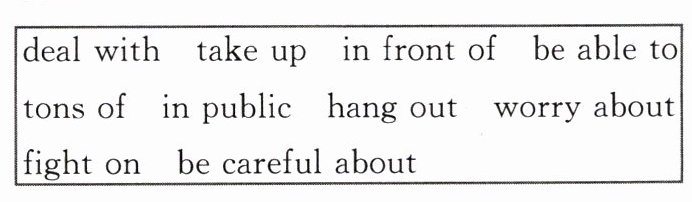 11. Hanging out 12. are able to 13. in public 14. took up 15. tons of 16. deal with 17. fight on 18. be careful about 19. worry about 20. in front of