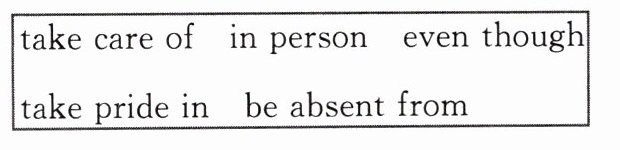 11. taken care of 12. Even though 13. was absent from 14. take pride in 15. in person