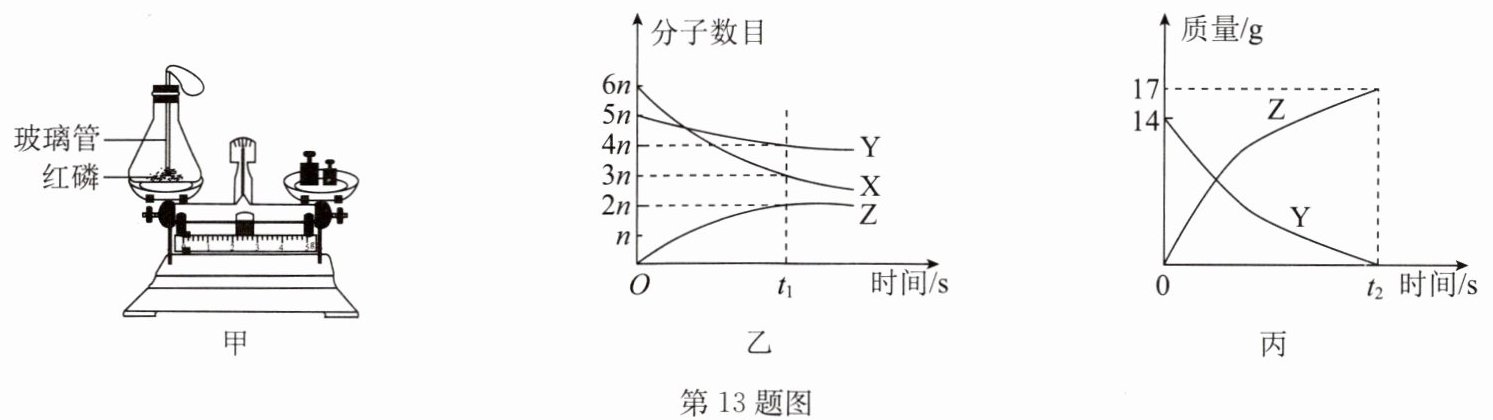 (填实验现象),天平仍平衡。(二)密闭容器中发生的某化学反应,各物质的分子数目随时间变化情况如图乙所示,物质Y和Z的质量随时间变化情况如图丙所示。请据图回答下列问题。