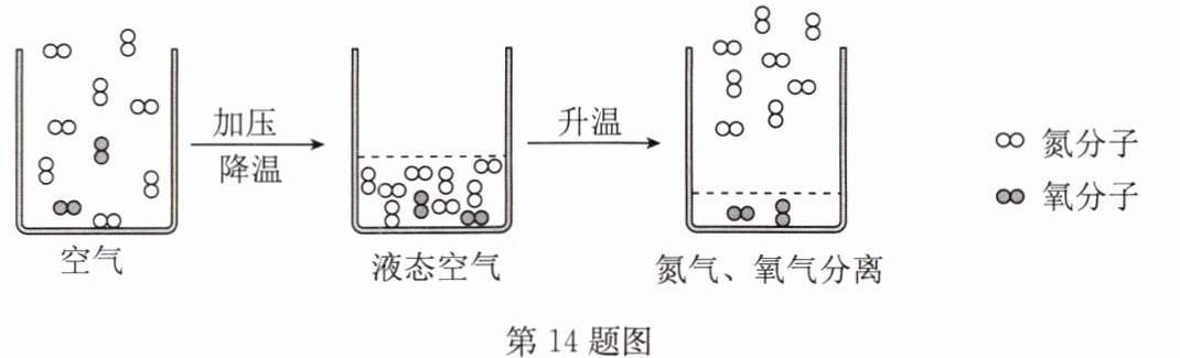 14. B 如图是从空气中分离氧气的示意图,请你写出从图中所获得的有关物质组成、结构、性质、变化的信息各一条: