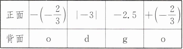 (2)good [解析]将卡片上的数由小到大排列为$-2.5<+\left( -\frac{2}{3} \right)<-\left( -\frac{2}{3} \right)<|-3|$,$\therefore$卡片上的字母组成的单词为 good.