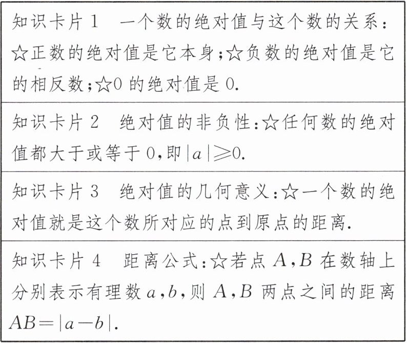 6. 实验班原创 “绝对值”是初中数学的重要知识点之一,它既有“数的意义”,又有“形的特征”,小明同学在学习过绝对值后,制作了如下知识卡片: