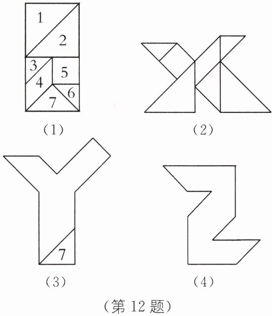 其中7块,恰好拼成一个长方形,如图(1)所示,后来又用它们分别拼出X,Y,Z等字母模型,如图(2)(3)(4)所示,如果每块塑料板保持图(1)的标号不变,请你参与:(1)将图(2)中每块塑料板对应的标号填上去;