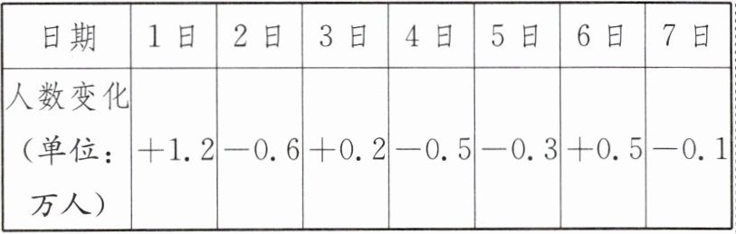 ∴10月1日的游客人数约是0.3+1.2=1.5(万人),10月2日的游客人数约是1.5-0.6=0.9(万人),10月3日的游客人数约是0.9+0.2=1.1(万人),10月4日的游客人数约是1.1-0.5=0.6(万人),10月5日的游客人数约是0.6-0.3=0.3(万人),10月6日的游客人数约是0.3+0.5=0.8(万人),10月7日的游客人数约是0.8-0.1=0.7(万人),