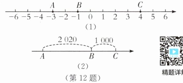12. 数形结合思想 (2024·福建厦门集美区期中)点A,B在数轴上分别表示有理数a,b,则A,B两点之间的距离表示为$AB= \vert a-b\vert,$如图(1),利用数形结合思想回答下列问题: