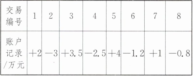 (2)第1笔:$8+2=10$(万元);第2笔:$10-3=7$(万元);第3笔:$7+3.5=10.5$(万元);第4笔:$10.5-2.5=8$(万元);第5笔:$8+4=12$(万元);第6笔:$12-1.2=10.8$(万元);第7笔:$10.8+1=11.8$(万元);第8笔:$11.8-0.8=11$(万元).故做完第5笔交易时,公司账户上的余额最多,是12万元.