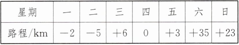 (1)六 55 [解析]七天中,行驶路程最多的一天是星期六,这一天的实际行驶路程为20+35=55(km).
