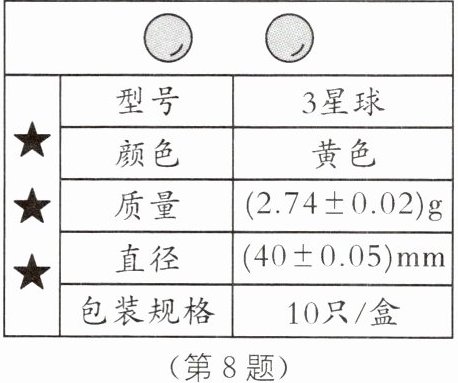 8. (2025·河北保定期中)如图,某品牌乒乓球的产品参数中标明球的直径是$40mm\pm 0.05mm$,下列乒乓球的尺寸中,不合格的是(