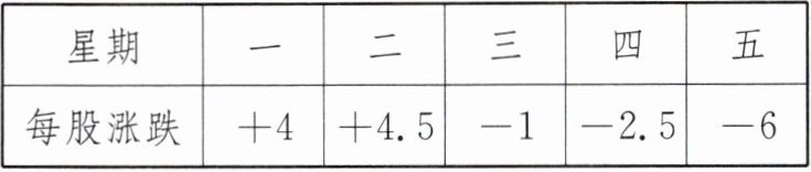 (1)由表格可知,每股涨跌的情况是:正数的表示上涨,是负数的表示下跌,所以上涨的是星期一、二;下跌的是星期三、四、五.