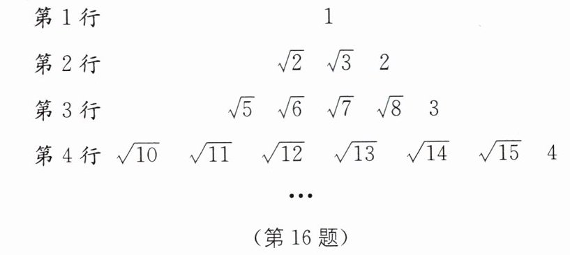16. 45 解析 根据题意,得第一行最后一位为1;第二行最后一位为2;…,以此类推,第n行最后一位为n.$\because 45^{2}=2025$,$\therefore \sqrt{2025}$在第45行.