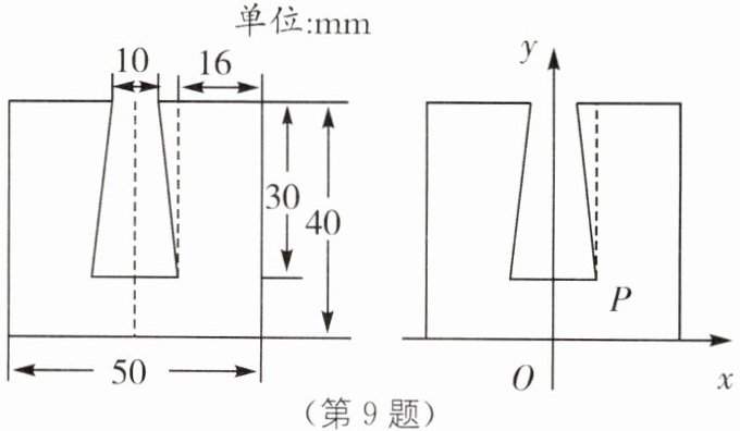 9. 小明为画一个零件的轴截面,以该轴截面底边所在的直线为x轴,对称轴为y轴,建立如图所示的平面直角坐标系. 若坐标轴的单位长度取1 mm,则图中转折点P的坐标表示正确的是( ).