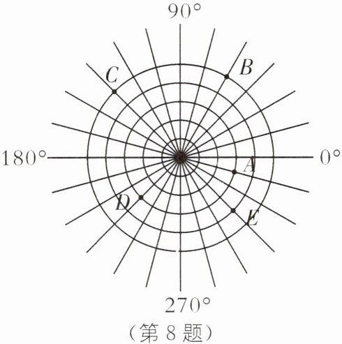 8.(2025·金华义乌月考)如图是雷达探测器在一次探测中发现的五个目标,若记图中目标$C的位置为(5,135^\circ)$,则点$E$的位置为(