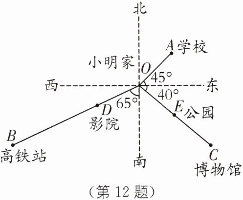 (1)学校在小明家北偏东$45^\circ$方向 2 km 处,博物馆在小明家南偏东$50^\circ$方向 4 km 处.