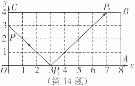 14. 如图,弹性小球从点 P(0,3)出发,沿箭头方向运动,每当小球碰到长方形 OABC 的边时反弹,反弹时反射角等于入射角,记小球第 1 次碰到长方形的边时的点为$ P_1,$第 2 次碰到长方形的边时的点为$ P_2,…,$第 n 次碰到长方形的边时的点为 Pₙ,则点$ P_3$的坐标是______,点$ P_2₀_2_5$的坐标是______.